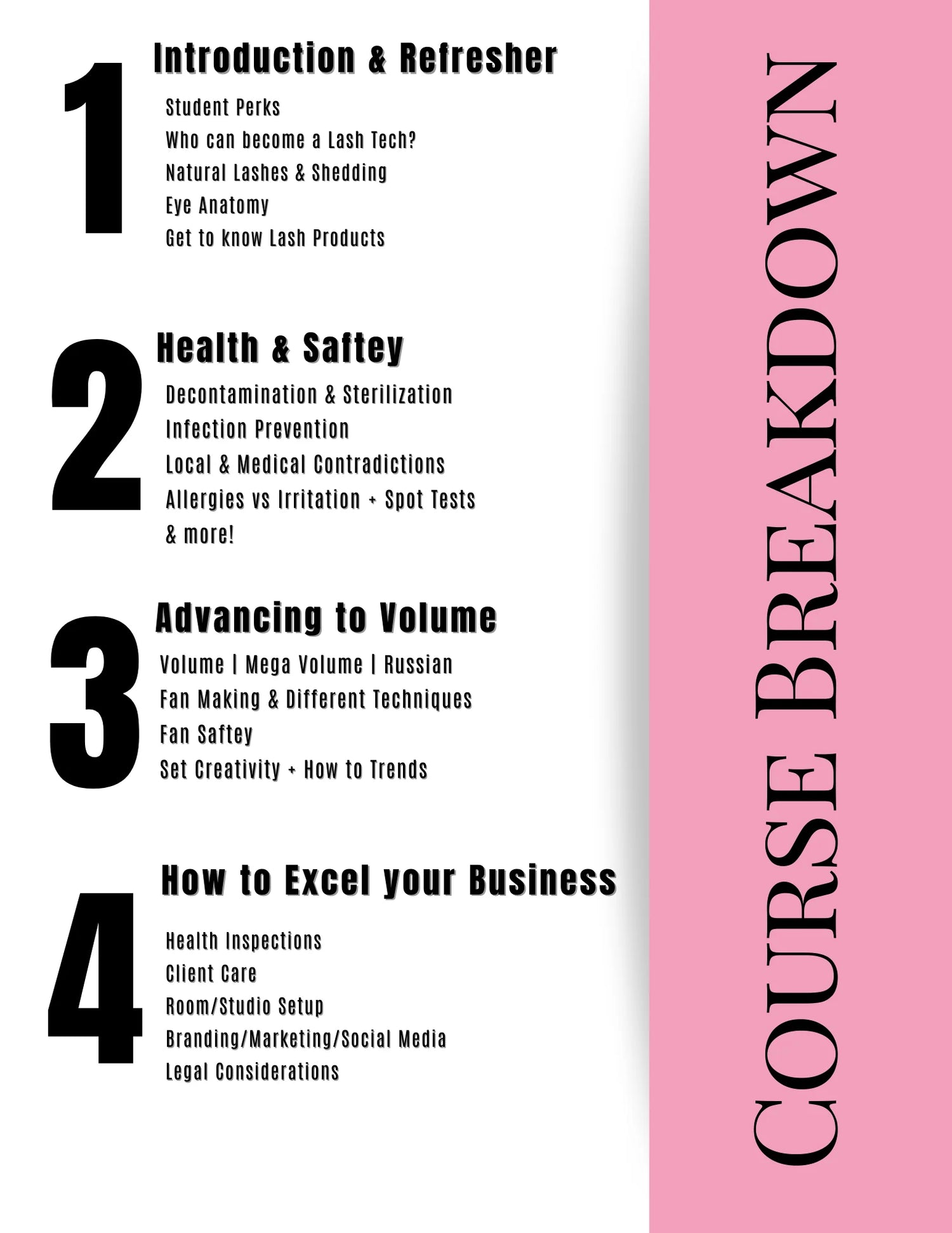 A course kit valued for your first 20-50 clients, you will be given a manual, ready to go waivers, client consent forms, exclusive Lash Loft discounts on products and services for life, free follow up support and lessonss, and a certification upon completion!